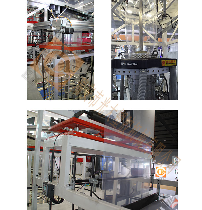 1、 內(nèi)冷式模頭:配合冷風(fēng)設(shè)定溫度,24小時全自動檢測控制薄膜寬度